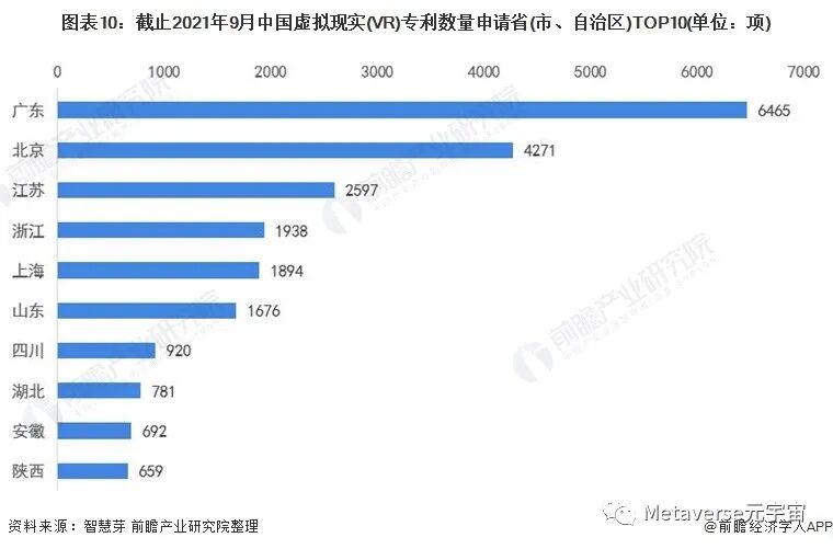中國方面,廣東為中國當前申請虛擬現實(VR)專利數量最多的省份,累計當前虛擬現實(VR)專利申請數量高達6465項。中國當前申請省(市、自治區)虛擬現實(VR)專利數量排名前十的省份還有廣東、北京、江蘇、浙江、上海、山東、四川、湖北、安徽、陜西等。