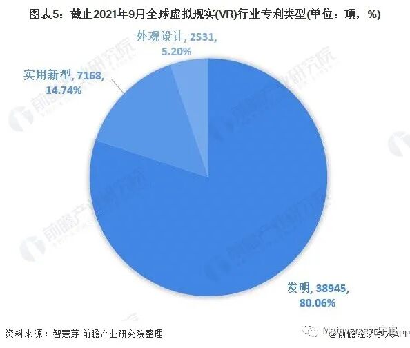 在專利類型方面,目前全球有38945項虛擬現實(VR)專利為發明專利,占全球虛擬現實(VR)專利申請數量最多,為80.06%。實用新型虛擬現實(VR)專利和外觀設計型虛擬現實(VR)專利數量分別為7168項目和2531項,分別占全球虛擬現實(VR)專利申請數量的14.74%和5.20%。