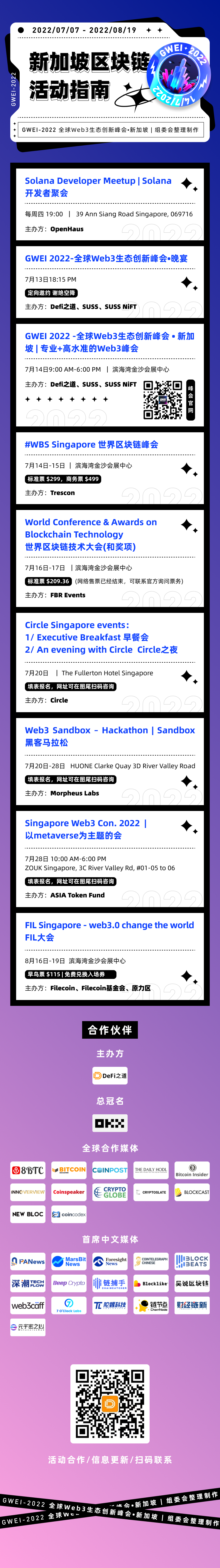 7月中旬,新加坡都有哪些寶藏活動不容錯過?經過Defi之道與GWEI2022峰會組委會詳細“調研”,整理出了這份“新加坡區塊鏈活動指南”!
