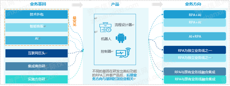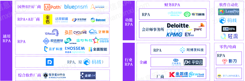 當前中國市場中的RPA廠商大致可以分為兩類:基于多種業務流程進行自動化的通用RPA和基于特定流程及逆行自動化的專用RPA。其中,專用RPA廠商具體還可以區分為基于沒有明顯業務屬性的通用業務流程的功能RPA和基于特定行業業務流程的行業RPA(如金融行業RPA等)。目前均有多種廠商試圖從不同的角度切入RPA市場。