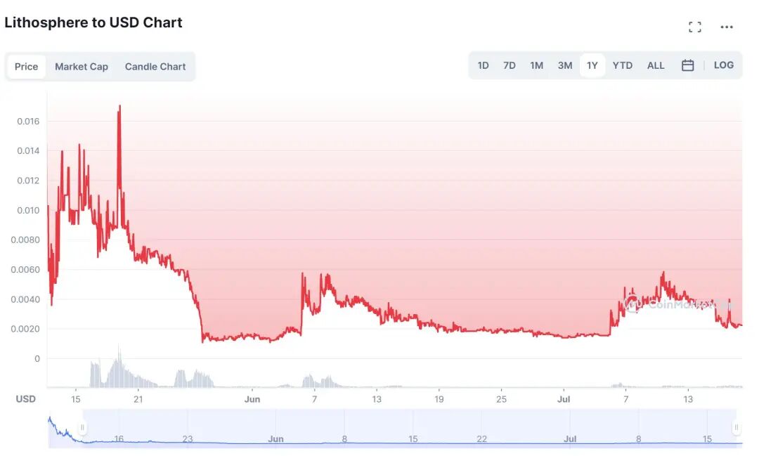 根據 Coinmarketcap 數據顯示,LITHO 在融資消息發布后,其從0.008 美元左右快速上漲到 0.016 美元,但 10 天后即跌至 0.0013 美元左右。其它也是類似的K線走勢。