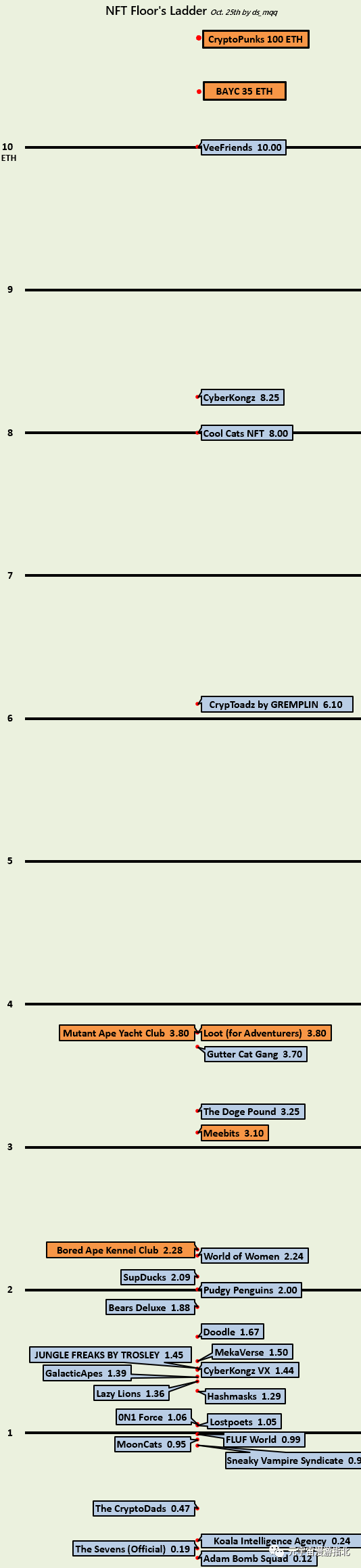 但是為什么大多數項目都不到 3 ETH,最大的原因在于,他們缺乏足夠共識以及歷史地位。樓上Meebits 3.1 ETH,誰的地位能觸及,用這個標準來看,我是不可能花比Meebits還貴的Floor來買這個區間的項目了。Meebits 血統純正富二代,第一款 3D NFT準備元宇宙爆發,Cryptopunks持有者大部分也有Meebits,看到這里,誰還會5 ETH買高達呢?