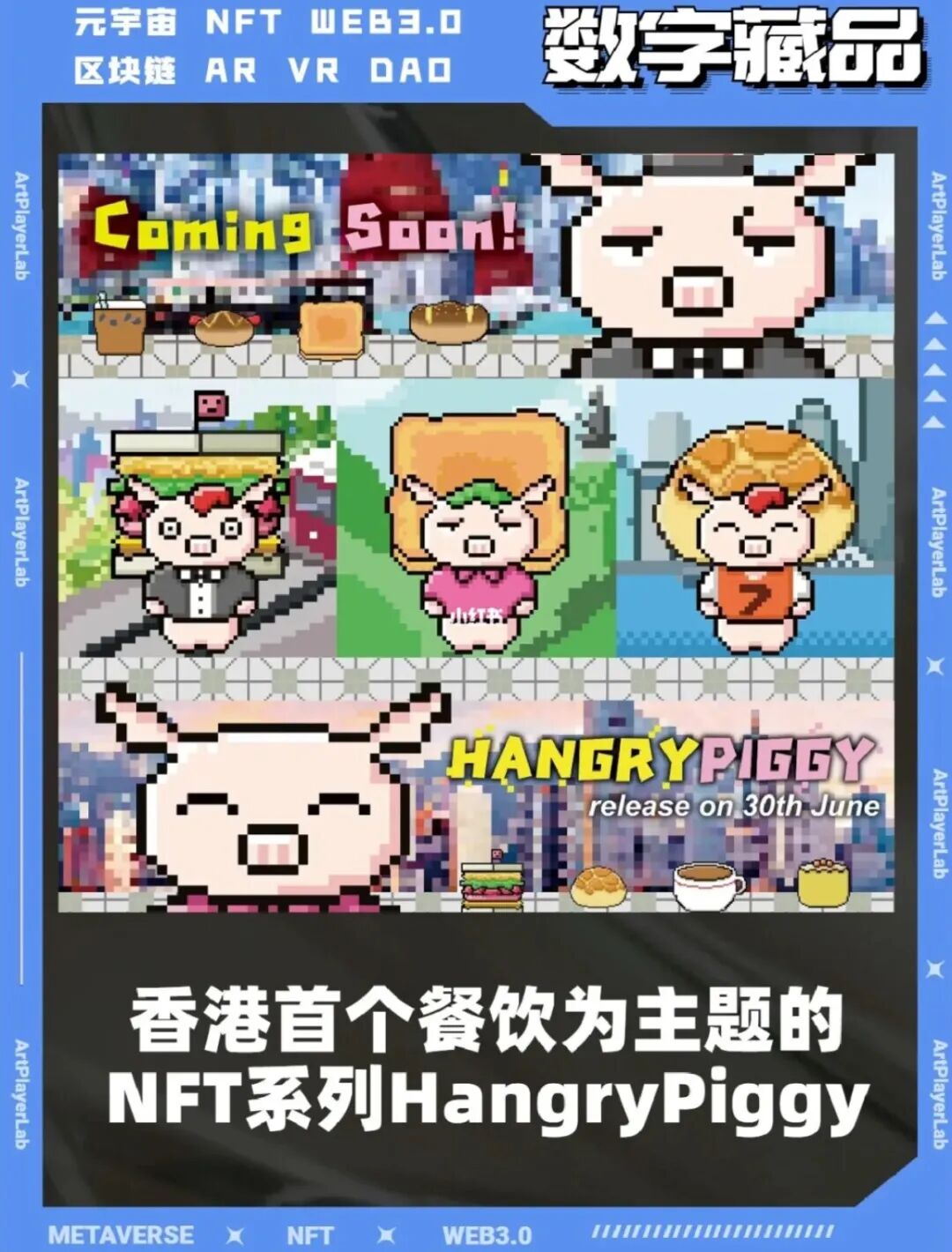 除了美食圖鑒的收藏功能之外,有品牌嘗試將數字藏品同線下美食的優惠權益結合起來。由發行公司HangryPiggy和香港創意營銷咨詢公司 Elevate PR 共同創建的,香港首個以餐飲為主題同名NFT“HangryPiggy”于6月30日上線,公開發行1,997只 Hangry Piggies數字藏品。發行方計劃與茶餐廳、街頭小吃攤、小吃店聯手,在展示香港飲食文化的同時,為NFT持有者提供優惠餐飲等獨家增值福利。