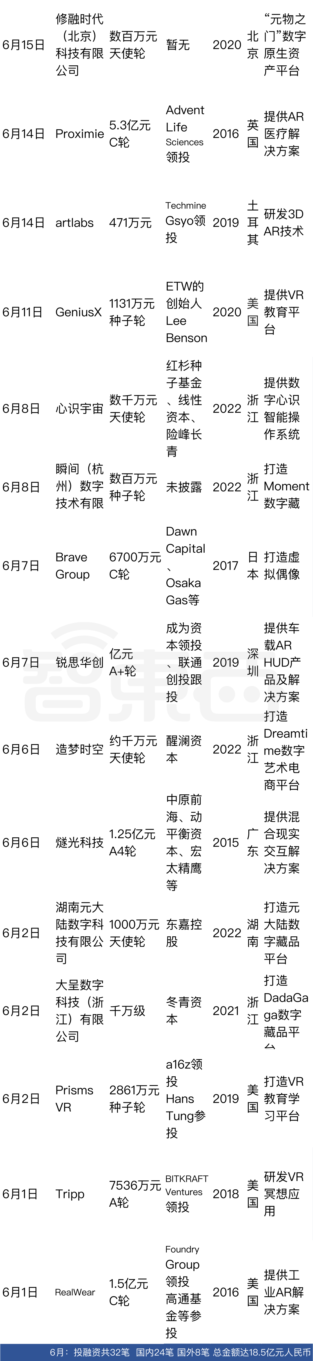 同時,底層技術賽道和游戲賽道也分別獲得了15筆、14筆融資,分別占比12.7%、11.9%。此外,硬件賽道也獲得了12筆融資,占比10.2%。統計2022年上半年數據后,我們可看到解決方案商、底層技術研發商、游戲方案商成為了元宇宙領域最受關注的三類企業。這意味著在商業落地、產品研發和內容生態三大領域,逐漸有更多的廠商的技術和商業模式得到了市場的認可。像是英國AR遠程手術平臺提供商Proximie獲得5.7億元C輪融資;國內元宇宙數字整合營銷解決方案商愛化身獲得千萬元融資;美國VR培訓解決方案商STRIVR和Transfer VR均獲得約2.3億元B輪融資。![]()