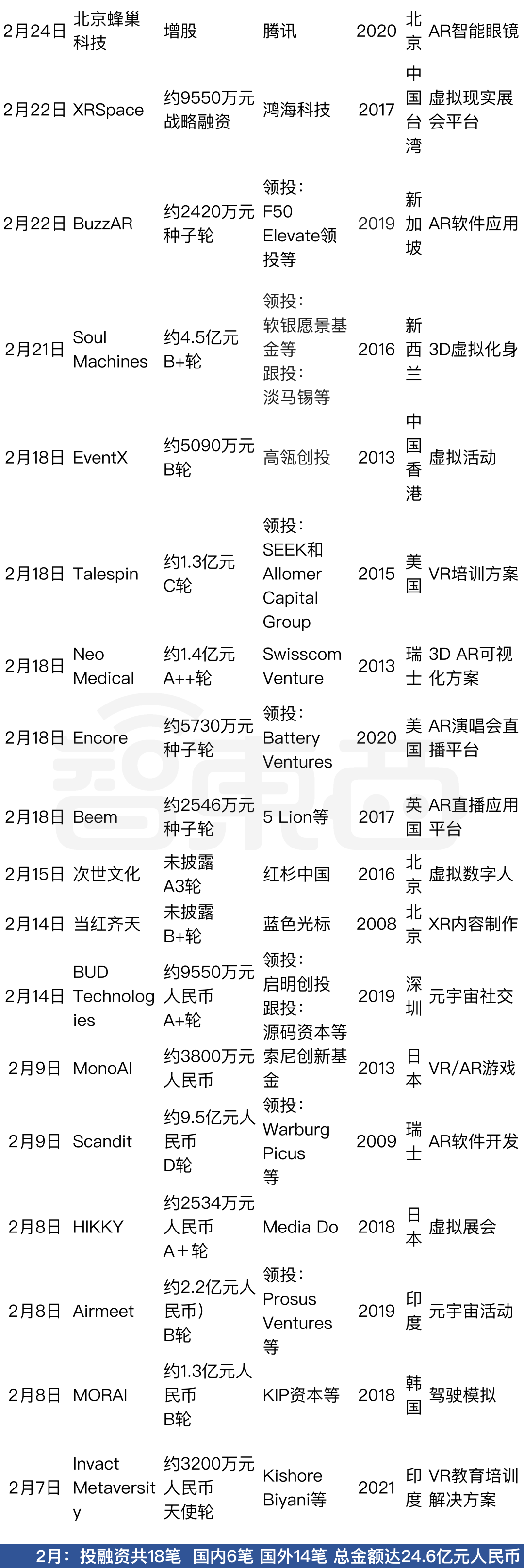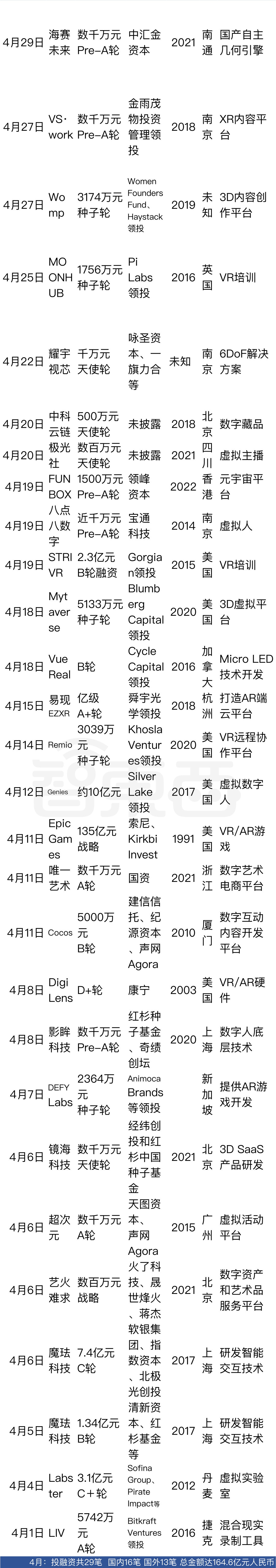 扒完上半年118筆融資!終于看清元宇宙到底在干嘛。“經濟不景氣”、“今年融資明顯變少了很多,投資者也比較謹慎”、“融資計劃有變動”......多位科技圈朋友都認為今年科技公司的融資環境更艱難。但相對其它賽道來說,元宇宙賽道則呈現出百花齊放的景象。據智東西不完全統計,無論是元宇宙賽道上游的供應鏈企業,還是下游的終端廠商都有不少獲得了億元以上的融資,并且在融資筆數和融資金額上都有大幅提升。2022年上半年,國內外元宇宙領域共有118筆融資,投資總金額達到270.6億元,超億元的融資有34筆,最大單筆融資達到135億元。4月16日,美國游戲開發商Epic Games宣布已完成20億美元(約135億元)融資,投資者是索尼、樂高集團幕后家族控制的公司Kirkbi。分開來看,2022年Q1季度,國內外元宇宙領域共有43筆融資,其中超億元的融資有18筆,融資總金額達到82億元,融資總金額同比增長51%。而在2022年Q2季度,元宇宙領域共有74筆融資,其中超億元的融資有16筆,融資總金額達到188.6億元。誰在經濟不景氣的大環境中逆流而上?哪些企業會是資本眼中的“潛力股”?又是誰拿下了億元級融資?我們梳理了2022年上半年(H1)與“元宇宙概念”關聯較強的虛擬數字人、VR/AR/XR內容、VR/AR/XR硬件以及數字藏品四大賽道的投融資情況,觀察元宇宙領域的最新動向。![]()