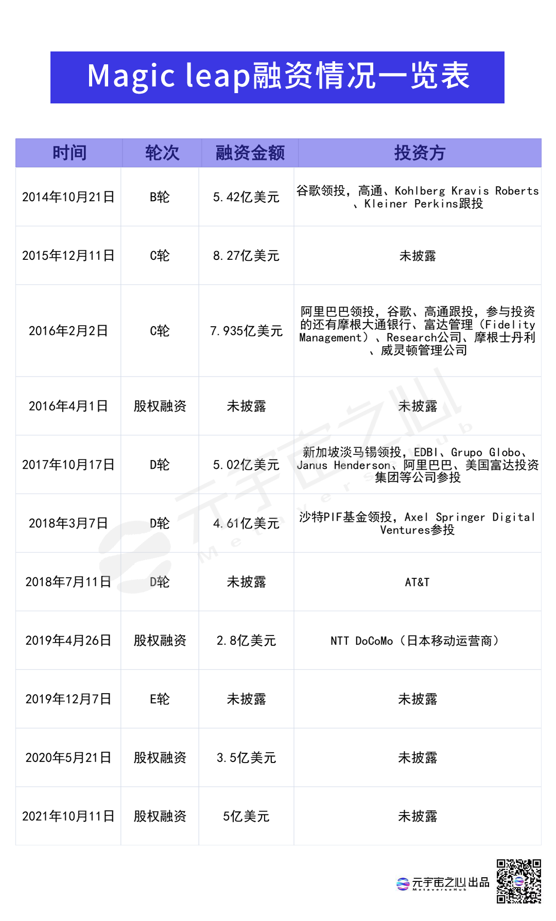 2017年10月,Magic Leap完成5.02億美元D輪融資,由新加坡淡馬錫領投,EDBI、Grupo Globo、Janus Henderson、阿里巴巴、美國富達投資集團等公司參投。