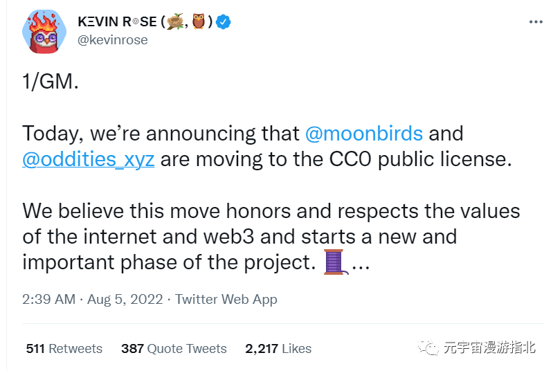 有人可能會說,Nouns 也是CC0才火的?永遠要記得Nouns背后的十位創始人都是加密圈里頂頂大名的OG,包含Gremplin,就是后來發布蟾蜍的大佬啊。而且,Nouns除了前五年10%給到項目方,其余100%Nouns收入都進入NounsDAO。對了,現在NOUNSDAO金庫已經有了超過4000萬美金的資金可讓Holder提案投票使用了。昨天拍賣的Noun #397,每天拍賣一件,有歡樂豆的大佬可以考慮加入web3最牛私董會NounsDaomfers火了,只是因為是CC0嗎?創始人Sartoshi本身就是一個推特有20萬人的OG,mfers的平易近人屌絲樣子,也讓我們都著迷。又有人說,今天Kevin Rose也宣布月鳥 & oddities 都開放為CC0。很明顯,月鳥的成功和是在發布CC0之前就因為kevin Rose + Utility大獲成功了。剛宣布完這個消息,opensea上馬上成交兩筆低于地板價的月鳥,短期內對于Holder似乎不是什么好消息。想想看,要是BAYC突然宣布也CC0了,李寧(剛聯名T恤)、環球音樂(四只猴子組成虛擬樂隊)等廠商,直接崩潰了吧。Rose大哥宣布月鳥和oddities都變更為CC0