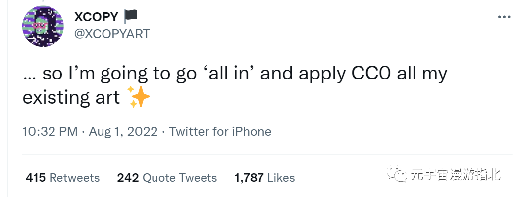 加密藝術家XCOPY (累積銷售金額超過6000萬美金,是加密藝術家中第五名),8月1日宣布所有作品都成為CC0(放棄公開版權任何人都可以商用)。這在知名加密藝術里面,是空前的。本篇就和大家聊下,NFT版權、傳統藝術版權、PFP版權、后續可能的影響。