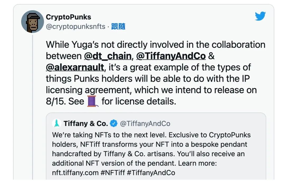 放在Tiffany此次的例子中,本質上來說,此次并不是Tiffany賣了產品給客戶,而是CryptoPunks頭像的持有者們委托Tiffany基于他們所持有NFT來創造新的IP,而這個新的IP就是Tiffany的CryptoPunks吊墜和一個新的NFT。
