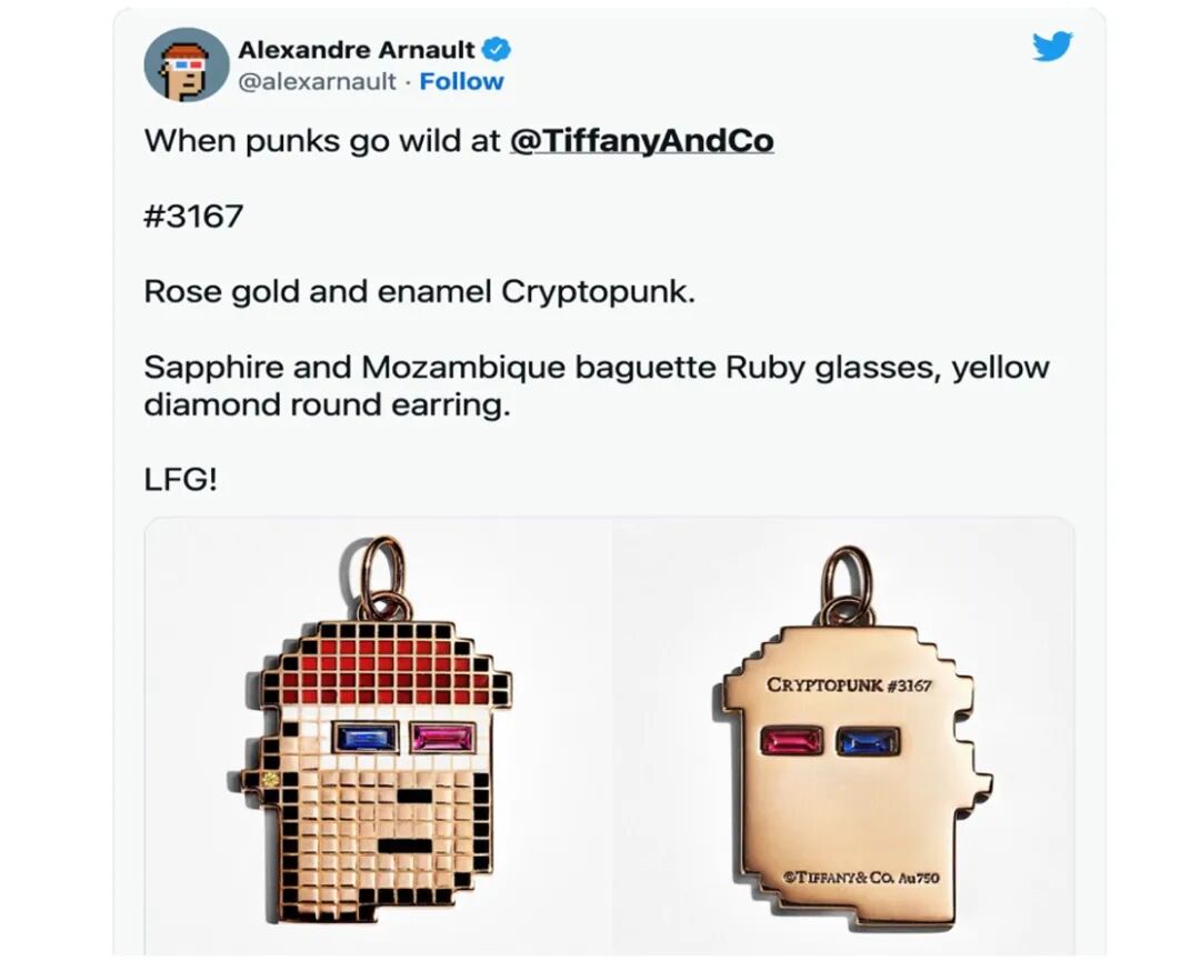 今年一月,Alexandre就將自己的Twitter和Instagram的頭像都換成了CryptoPunks,緊接著4月就在推特上曬出了以自己CryptoPunks為藍本做的Tiffany飾品,當時就讓外界猜測Tiffany會在NFT上有所動作。但與此同時,他的父親、LV掌門人 Bernard Arnault也曾公開表示對于低價出售品牌的虛擬產品沒有興趣。