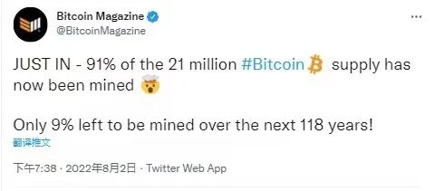 Bitcoin Magazine(比特幣雜志)發推表示,2100萬個比特幣供應中的91%現在已經被挖礦出來了,在接下來的118年里,只剩下9%可以被挖礦。