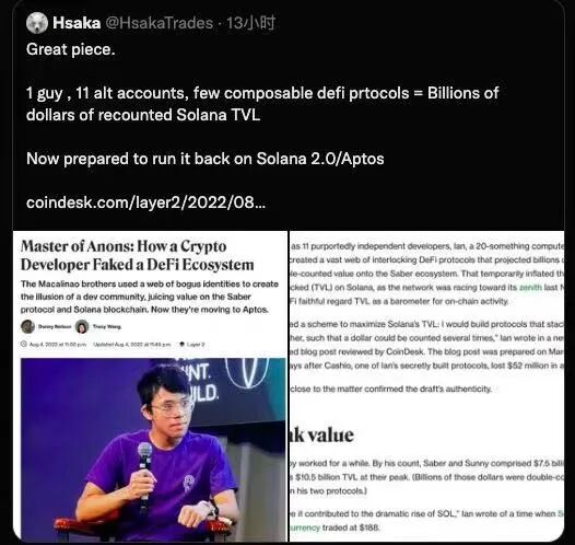 近期,Coindesk來了個驚天揭秘,下面這位小哥以一己之力,分飾多角,匿名貢獻了Solana上11個項目,75%的tvl。現在小哥要轉投aptos了,顫抖吧!