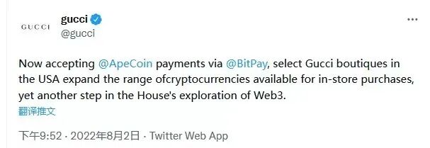 8月2日,Gucci在推特兒宣布現在可以通過BitPay接受ApeCoin付款,美國的部分 Gucci 精品店擴大了可用于店內購買的加密貨幣范圍,這是品牌探索 Web3 的又一步。