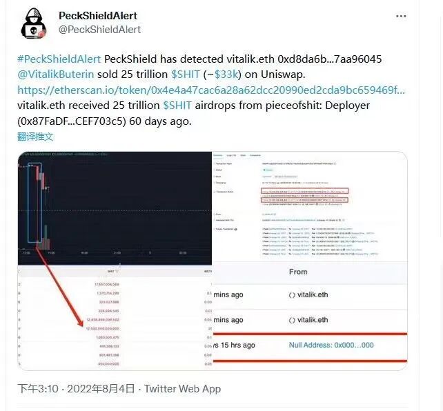 8月4日,根據PeckShield提供的鏈上數據顯示,V神將近三個月前空投給他的25萬億SHIT幣在Uniswap上分兩次拋售,獲得20.1RTH。