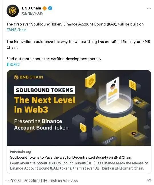 8月1日,幣安宣布將在BNB鏈上推出靈魂綁定代幣BAB,通過 KYC 的用戶可以直接在賬戶中鑄造 BAB,也可以選擇其他錢包來存儲該代幣。