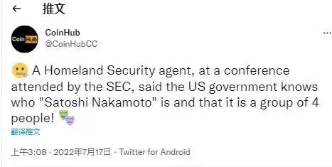 據CoinHub發布的推文,一位美國國土安全部成員在參加SEC的會議時表示,美國政府知道誰是中本聰,而且是一個4人團體。