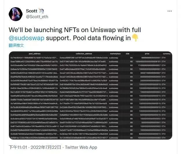 7月22日,Uniswap NFT產品負責人Scott發推稱將在 Uniswap 上推出 NFT,并提供完整的sudoswap支持。