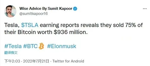 7月21日,根據特斯拉$TSLA的收益報告顯示,他們出售了價值 9.36 億美元的 75% 的比特幣。