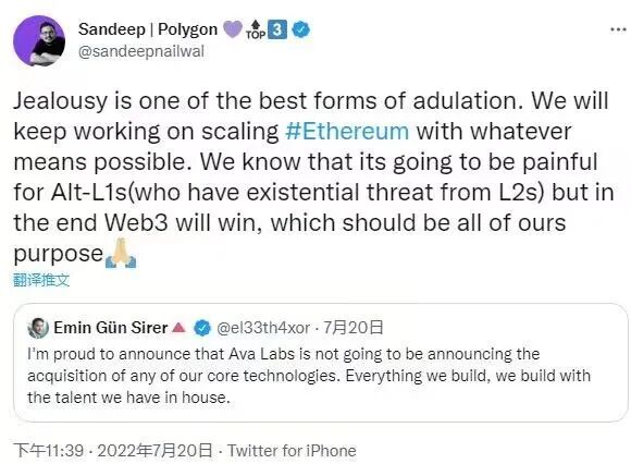 Alavanche創始人暗諷Polygon核心技術依賴收購,Polygon聯創回應稱發展Web3才是共同目標