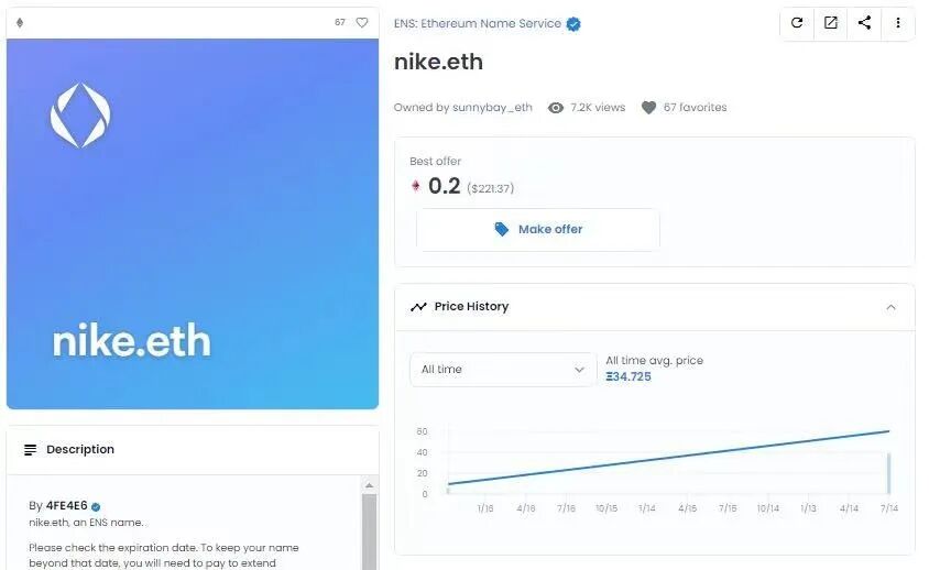 OpenSea數據顯示,ENS域名nike.eth以60 ETH 的價格出售,購買者為sunnybay.eth。