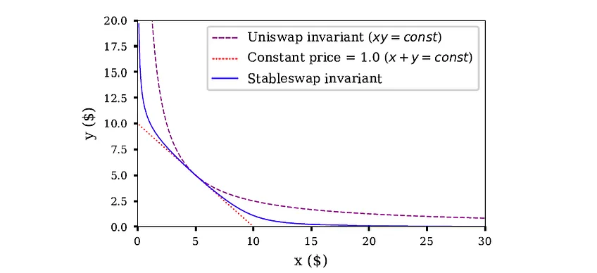 Curves Stableswap 是一種特殊的 CSMM,流動池平衡時就是CSMM,一旦池變得不平衡就會轉向 CPMM,它通過找到自己的市場匹配度,顯著減少了相關資產交易時的滑點。