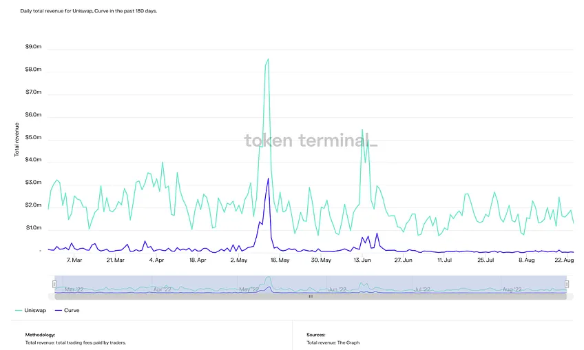 Uniswap 和 Curve 過去 180 天的每日總收入(來源:Token Terminal )
