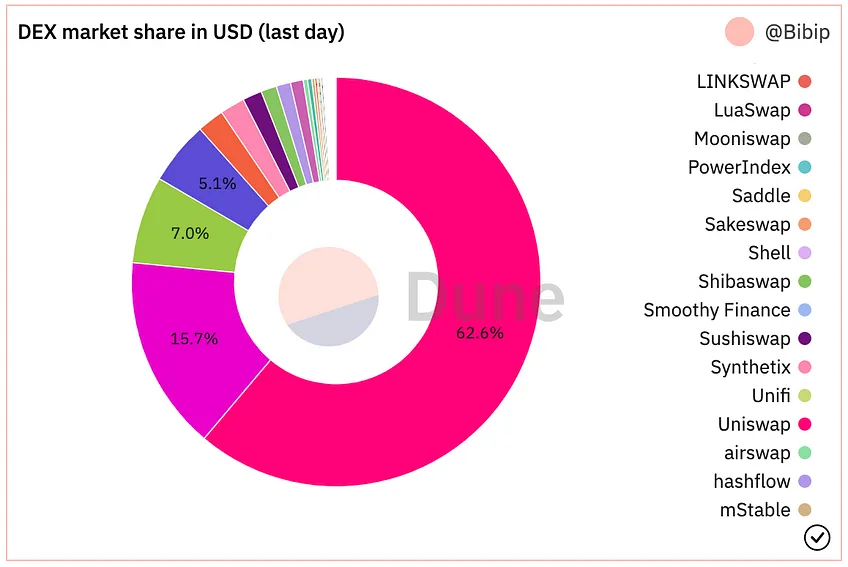 自 Uniswap V3 推出以來,他們擁有大約 7000 億美元的交易量,在所有 Uniswap 不同版本的交易中占到 90% ,此外以超過 55 億美元的 TVL(2021 年 11 月達到 100 億美元的峰值)占據 DEX 市場份額的絕大部分。