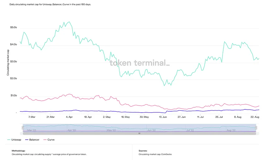 Uniswap、Curve 和 Balancer 過去 365 天的每日流通市值(來源:Token Terminal )