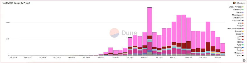 在本節中,我們將分析他們的突破性創新、他們的統治地位以及他們如何壟斷了市場。我們將以最近幾個月帶來顯著創新的其他幾個 AMM 來結束本章,從時間線上看,第三代 AMM 是2021年年中直到最近幾個月的加密貨幣熊市才開始的。