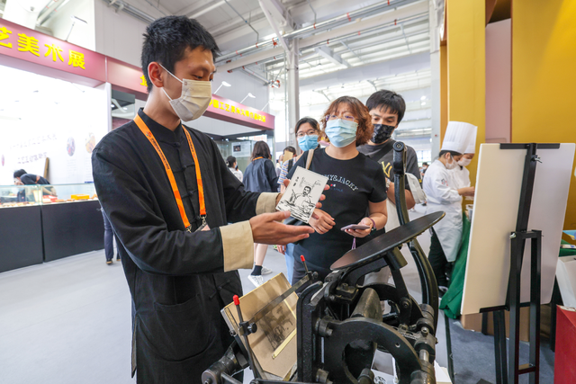 中山公園來今雨軒的工作人員,現場用傳統凸版印刷機制作魯迅手工明信片,引來參觀者排隊領取。
