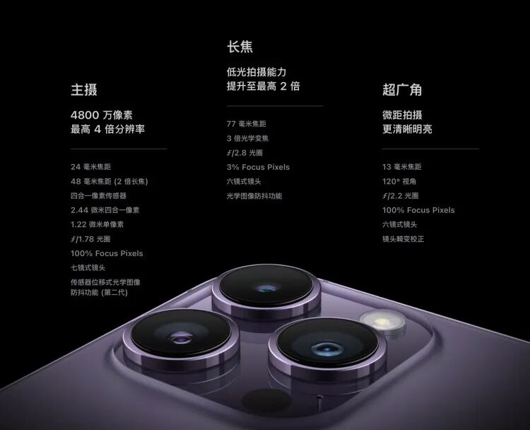 在影像上,iPhone 14 Pro/Max將主攝升級為了4800萬像素四合一主攝,24毫米焦距,/1.78光圈,7P鏡頭,并且加入了第二代位移傳感器光學防抖技術。