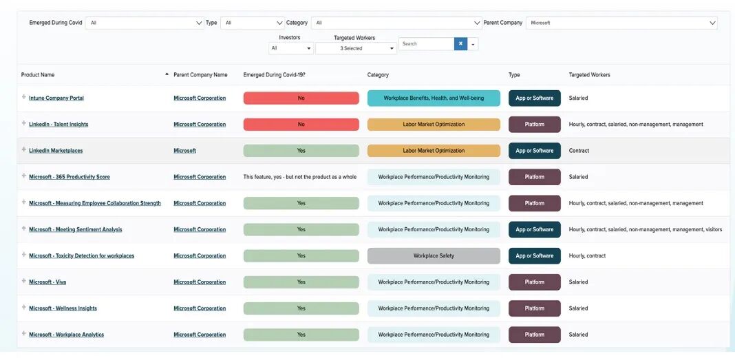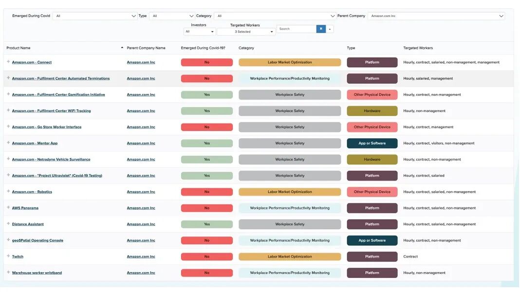 去年年底,美國雇員非營利組織Coworker.org就發布了一篇報告,總結了自2018年以來被各大公司使用的550多種以勞動力為中心的技術產品,并按照技術歸屬公司、技術工具類型、使用對象、是否在疫情期間出現等分類制作了一個詳細的數據查詢系統。這些技術工具中既包括了辦公效率軟件、行為監測軟件也包括工資自動化類軟件等等。其中,占比最高的就是績效類、工作目標管理類的工具。