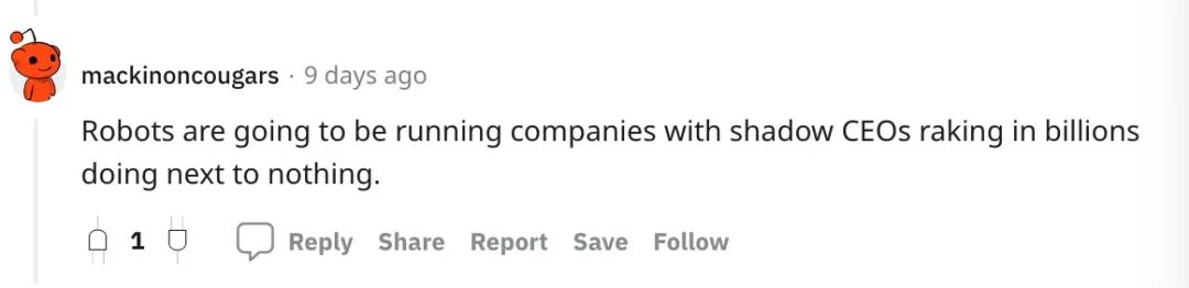 還有人說,可能以后的公司都會由機器接管了,公司的高管們只需要在暗處瘋狂拿錢就行。