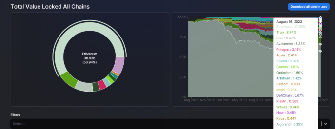 2016 年 ETC 分叉時,Tether ( USDT ) 的市值僅為 0.65%,穩定幣剛開始走入人們的視野,以太坊鏈上生態還未起步,無需考慮智能合約和代幣問題,而且技術上實現難度也比較低。而如今,不僅穩定幣成為一種廣泛的鏈上資產,其中明確支持合并的 USDT 與 USDC 就占到了整個加密市值 10.6% 以上。而且以太坊還坐擁 389 億美元 TVL,擁有最為龐大的生態網絡,目前以太坊主網上部署的智能已經多達 5120 萬個,即使是現在處于熊市的非活躍期,目前依舊在以每周 5-6 萬個新增智能的速度增長。