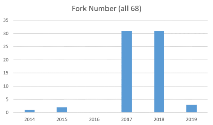 在 Forkdrop 收錄的有分叉事件的統計中,BTC 歷史上一共有過 68 次分叉,其中 62 次集中在 2017-2018這兩年。