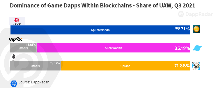 首先是 Splinterlands,這是一款基于 Hive 區塊鏈的游戲。Splinterlands 是一款卡牌游戲,玩家必須在 PvP (玩家對戰) 戰斗中使用自己的 NFTs 卡牌制定戰略來打敗其他玩家。通過成功完成對戰任務,玩家可以賺取 Dark Energy Crystals (DEC) 代幣,這是 Splinterlands 游戲中的主要貨幣。此外,今年 8 月份,這款游戲推出了其游戲內的治理代幣 SplinterShards (SPS),推動這款游戲在行業排名中占據了領先地位,見下圖:上圖:自推出 SPS 代幣以以來,Splinterlands 游戲的獨立活躍錢包 (UAW) 數量增長趨勢。圖源:DappRadar今年 9 月份,Splinterlands 游戲每天吸引了超過 24.5 萬個獨立活躍錢包,與今年 6 月底相比增長了 3267%。這一用戶量的增長使得該游戲產生了 5800 萬筆交易。就項目本身而言,該游戲的市值 (包括所有的卡牌和收藏品) 已經超過了 2 億美元。要了解更多關于這款游戲的信息,可閱讀這個指南:https://dappradar.com/blog/splinterlands-guide-to-play-and-earn此外,基于 WAX 區塊鏈的 Alien Worlds 游戲、基于 EOS 區塊鏈的 Upland 游戲也在這一年中戲劇性地增加了各自的玩家基數。Alien Worlds 是一款基于挖礦和戰斗的「邊玩邊賺」游戲,每月平均吸引了超過 50 萬個活躍錢包數;Upland 也是一款「邊玩邊賺」游戲,玩家在游戲中擁有復制舊金山、布魯克林和曼哈頓等真實城市的虛擬財產,該游戲在 2021 年的大部分時間里都是玩家玩得最多的游戲之一。上圖:Splinterlands、Alien Worlds 和 Upland 游戲的用戶量分別在 Hive、WAX 和 EOS 區塊鏈中的游戲類 dApps 的用戶量占比情況。圖源:DappRadar上周,Alien Worlds 和 Splinterlands 這兩款游戲共吸引了超過 100 萬個獨立活躍錢包數。但還并不止于此:CryptoBlades、Mobox和無數其他的區塊鏈游戲已經將幣安智能鏈 (BSC) 從一個原本實際上依賴于 DeFi 的區塊鏈網絡變成了一個充斥游戲類 dApps 的網絡。雖然「邊玩邊賺」的模式正在徹底改變游戲行業的范式,但這似乎只是某個更大事件的開始:它正在模糊現實世界和新的虛擬現實 (即元宇宙) 之間的界限。