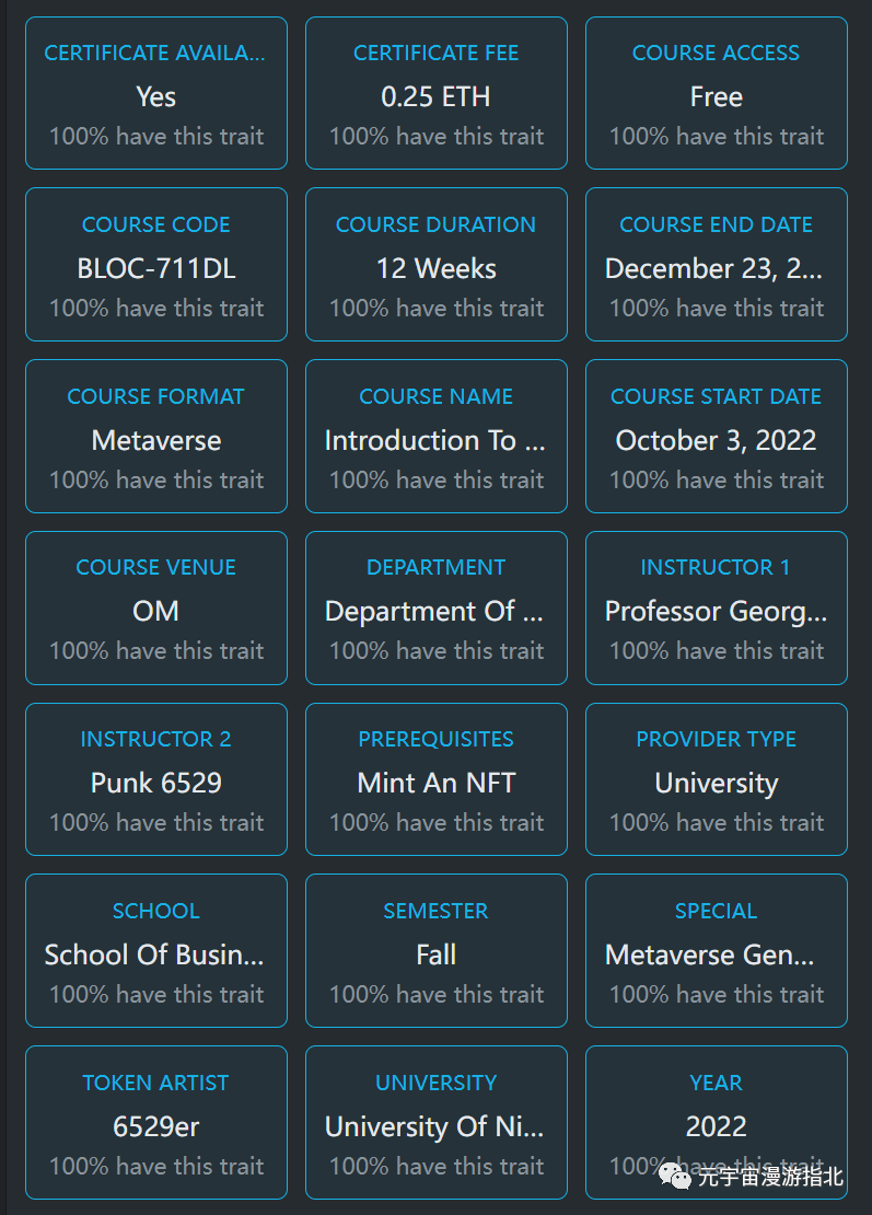 把課程信息都放在NFT的trait也是絕了,10/3號開始 12/23結束,報名免費認證花錢0.25ETH,課程有錄播,其他細節自己看看吧!