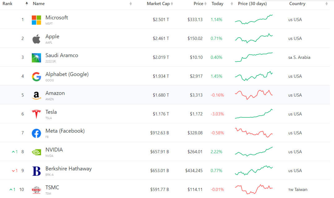 此次市值登頂之后,按最新股價計算,全球市值排名前十的公司中,有3家超過2萬億美元(微軟、蘋果、阿美)。前十名中,有八家都是科技巨頭。