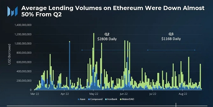 2022 年二季度,DEX 的日均交易量為 27.8 億美元,三季度這一數字降至 18.3 億美元,同比交易量也下降到大約 8 億美元。期間,Uniswap 的主導地位從第二季度末的 60% 增加到 8 月底的 2%,但整個第三季度始終保持在 DEX 市場份額的 75% 左右。三季度,Crypto 市場平均貸款交易量急劇下降。從二季度的日均 2800 億美元降至 1160 億美元。7 月份是一個明顯緩慢的月份,8 月份交易量略有回升,主要因為 ETH POW 空投對現貨 ETH 的需求增加了。![]()