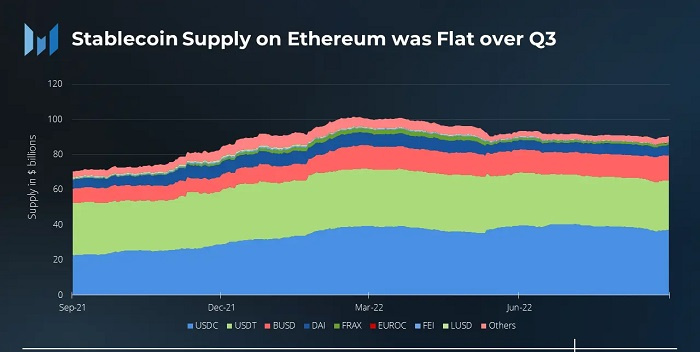 以太坊上的日平均NFT交易者數量和日均交易量較二季度有所下降NFT 日均交易量大幅下降,但日均交易者數量的降幅并沒有預期那么多,NFT 行業平均每天仍能吸引大約 40,000 名忠實用戶。第三季度平均每月以美元計算的 NFT 交易量比 1 月份下降了 90%,銷售額不到 10 億美元,而第二季度則高達 46 億美元。需要注意的是,下跌不僅與 NFT 市場放緩有關,還與 ETH 價格下跌有關。OpenSea 在第三季度繼續占據最大的 NFT 市場交易份額。Sudoswap 在 2022 年三季度上線,類似于用于 NFT 的 Uniswap 的流動性池,其交易量在 8 月達到頂峰。穩定幣與以太坊的相關性十分緊密,雖然穩定幣的走勢和總體交易量與第二季度相比基本沒有變化,但三季度一些政策事件值得關注,比如: