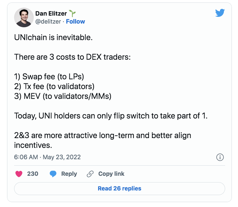 那另外兩個成本,gas 交易費用以及 MEV 呢?只要 Uniswap 依舊依賴于以太坊或其他通用鏈和 rollup 運行,UNI 持有者目前就沒有很好的方法來利用其中的任何一個。