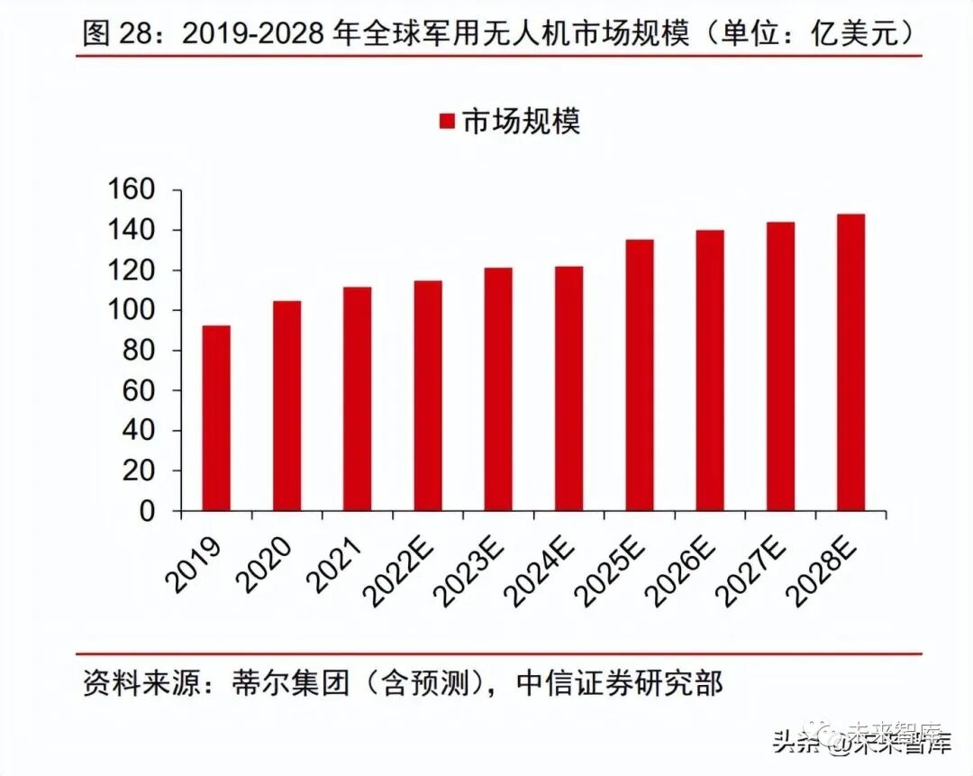 無人機系統軍事需求旺盛,軍貿市場空間廣泛。無人機系統憑借其作戰性能優越、執 行任務和時長半徑范圍大、環境適應性高、經濟性強等優勢,已裝備至多國的武器裝備體 系中,全面應用于現代高技術局部戰爭中,為未來武器裝備發展的重點方向,軍事需求旺 盛。據蒂爾集團預測,2028 年全球軍用無人機市場規模可達 147.98 億美元,對應 2019-2028 年復合增長率約為 5.36%,市場穩健增長進一步擴容。