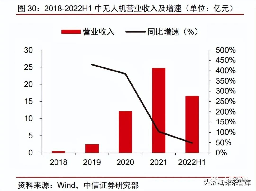 承接成都所業務,營收業績保持快速增長。2019 至 2021 年,中無人機營收與歸母凈 利由 2.51/-0.10 億元大幅提升至 24.76/2.89 億元,主要系自 2019 年起中無人機承接航空 工業成都所翼龍無人機系統業務,開始作為總體單位獨立對外銷售翼龍無人機。2019 年 成都所仍繼續執行部分已簽訂合同,公司交付量較小,隨后續訂單陸續轉由公司開展,營 收和歸母凈利持續保持較高增幅。22H1 公司積極開拓市場,軍貿整機業務增長帶動營收 同比提升 47.93%至 16.62 億元,受研發費用大幅提升影響,疊加軍貿市場采取競爭性價 格策略,公司實現歸母凈利 2.36 億元,同比提升 5.10%。