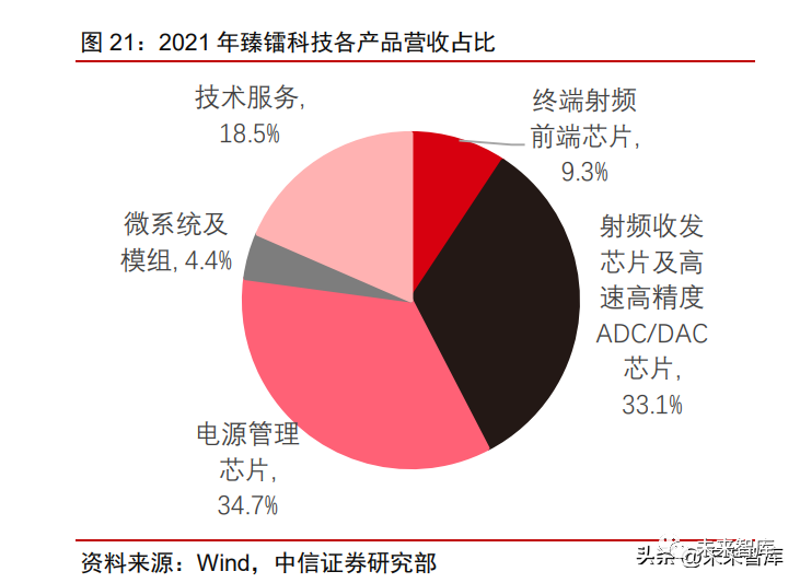 芯片類產品為公司營業收入和毛利最大來源。從收入結構來看,芯片類產品(終端射 頻前端芯片、射頻收發芯片及高速高精度 ADC/DAC 芯片、電源管理芯片)作為公司主營 業務產品,自 2019 年進入批產后占公司營收的比重均在 70%以上,2021 年貢獻公司營業 收入的 77.1%和毛利潤的 78.87%。其中終端射頻前端芯片和射頻收發芯片及高速高精度 ADC/DAC 芯片貢獻最為突出,分別占 2021 年公司營收的 33.1%和 34.7%,占公司毛利 潤的34.63%和34.25%;微系統及模組營收占比迅速提升,從2020年的0.14%增長至2021 年的 4.39%。公司產品不斷向下游延伸,各類產品型號逐步實現量產,研發收入占比呈下 降趨勢,技術服務營收占比自 2018 年的 60.43%下降至 2021 年的 18.47%。
