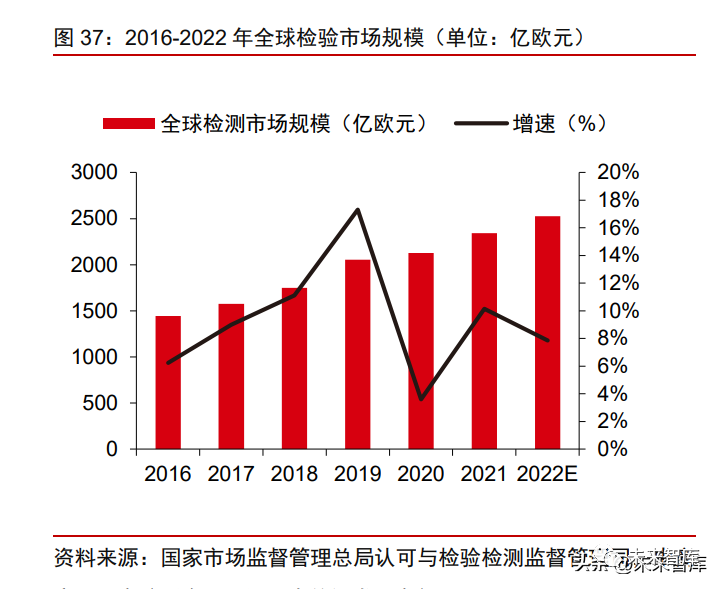 全球檢測市場穩步擴張,中國檢測市場規模持續提升。隨著全球經濟的不斷發展,終 端花費和檢測意愿度不斷提升,檢驗檢測服務業取得長足發展。根據中商產業研究院轉載 國家市場監督管理總局認可與檢驗檢測監督管理司的數據統計,全球檢驗檢測行業的市場 規模從 2016 年的 741 億歐元增長至 2020 年的 2127 億歐元,年復合增長率在 10.14%;同時,我國檢測市場快速發展,2020 年中國檢驗檢測服務市場規模已經達到 3585.92 億 元(不包括貿易保障監測和醫院醫藥),較上年同比增長 11.2%。中商產業研究院預計 2022 年中國檢驗市場規模達到 4414.1 億元。