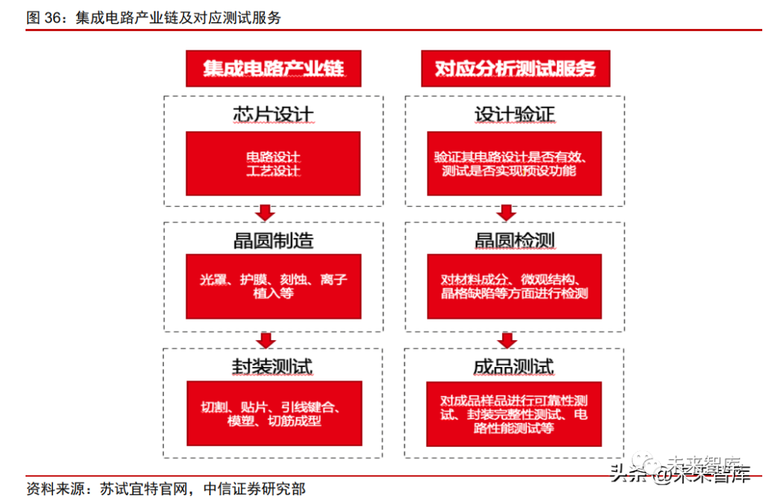 半導體行業產業鏈長、容錯率低,驗證與分析服務是貫穿整個產業鏈的重要一環。集 成電路產業鏈分為電路設計、晶圓制造、芯片測試以及封裝等環節,集成電路設計的產品 成功與失敗、產品生產的合格與不合格、產品應用的優秀與瑕疵均需要驗證與測試。集成 電路測試主要是對芯片、電路等半導體產品功能和性能進行驗證的步驟,應用市場廣泛, 具體包括設計階段的設計驗證、晶圓制造階段的過程工藝檢測、封裝前的晶圓測試以及封裝后的成品測試。而受到集成電路設計行業的飛速發展帶動,設計驗證需求快速提升,驗 證與分析服務創造的價值主要體現在芯片設計企業成本的降低和可靠性的提高。