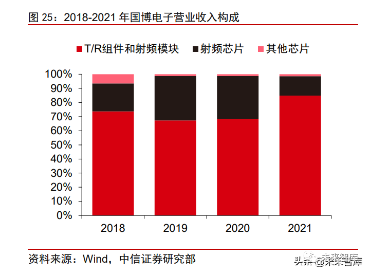 星載相控陣 T/R 芯片為公司營業收入和毛利最大來源。相控陣 T/R 芯片系列(星載、 地面、艦載、車載、機載)作為公司主營業務產品,2019 年至 2021 年營收占比均在 85% 以上,2021 年貢獻公司營業收入的 91.50%和毛利潤的 93.97%。其中作為主要產品的星 載相控陣 T/R 芯片貢獻最為突出,2019 至 2020 年營收占比持續保持 70%以上,三年營 收復合增速達 9.07%, 2021 年分別貢獻公司營收的 71.90%和毛利潤的 74.45%。隨公司 技術逐漸積累與產品線不斷豐富,公司積極開拓地面、艦載、車載和機載市場,其營收和 毛利占比正不斷提升,地面相控陣 T/R 芯片營收占比由 2019 年的 3.60%提升至 2021 年 的 20.45%。