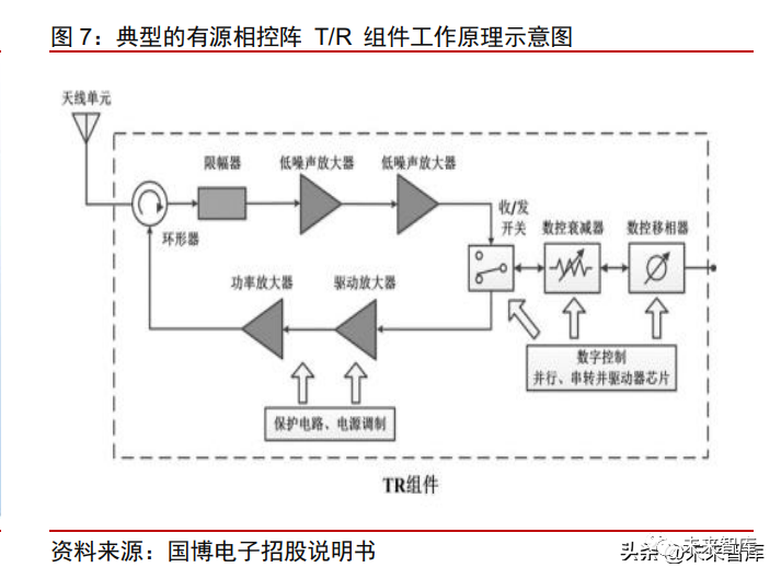 T/R 組件核心功能已采用芯片實現,可分為放大類芯片和控制類芯片。T/R 組件主要 包含發射通道、接收通道和驅動控制三個部分。隨著固態有源集成電路的發展,T/R 組件 中的核心功能全部采用芯片實現,其中發射通道和接收通道的主要芯片為放大類芯片,驅 動控制的主要芯片為控制類芯片。放大類芯片中,低噪聲放大器一般用于實現接收通道的 射頻信號放大,處于接收鏈路的前端,低噪聲放大器的性能對整個通信設備的信噪比等指 標至關重要;功率放大器的作用是對發射通道的射頻信號進行放大,是無線通信設備射頻 的核心組成部分,影響整個無線通信設備發射性能、系統功耗等重要指標。控制類芯片中, 射頻開關是指可對射頻信號通路進行導通和截止的射頻控制元件,用于信號切換到不同的 信號通路中去;數控衰減器主要用來控制微波信號幅度,實現對信號的定量衰減,通過數 控衰減器調整射頻鏈路的信號幅值,能夠保證信號處在合適的電平上,從而防止發生過載、 增益壓縮和失真。