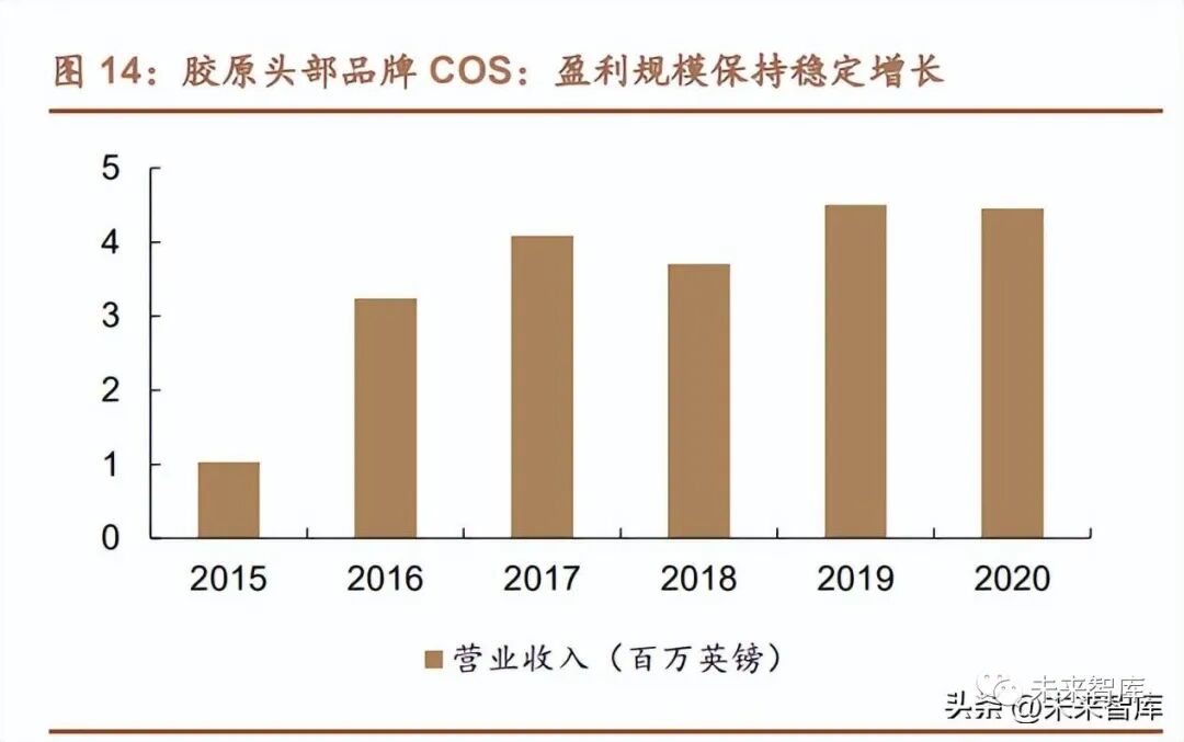海外膠原頭部品牌 COS 盈利規模保持穩定增長,業務結構四輪驅動。Collagen Solutions 成立于 2013 年,主營醫用級膠原生物原料,營收規模穩定增 長,產品遠銷全球,2019 年財報顯示,公司已在英國、美國、新西蘭設立運營部 門,中國、韓國、澳大利亞等地搭建銷售團隊;業務結構來看,膠原蛋白原料供 應構成核心業務,并逐漸向產品研發轉型,客戶產品從研發階段轉為商業化供應 時,助推公司打造從研發到生產功能性醫用級膠原蛋白的閉環,向價值鏈上游轉 移的戰略取得進展。