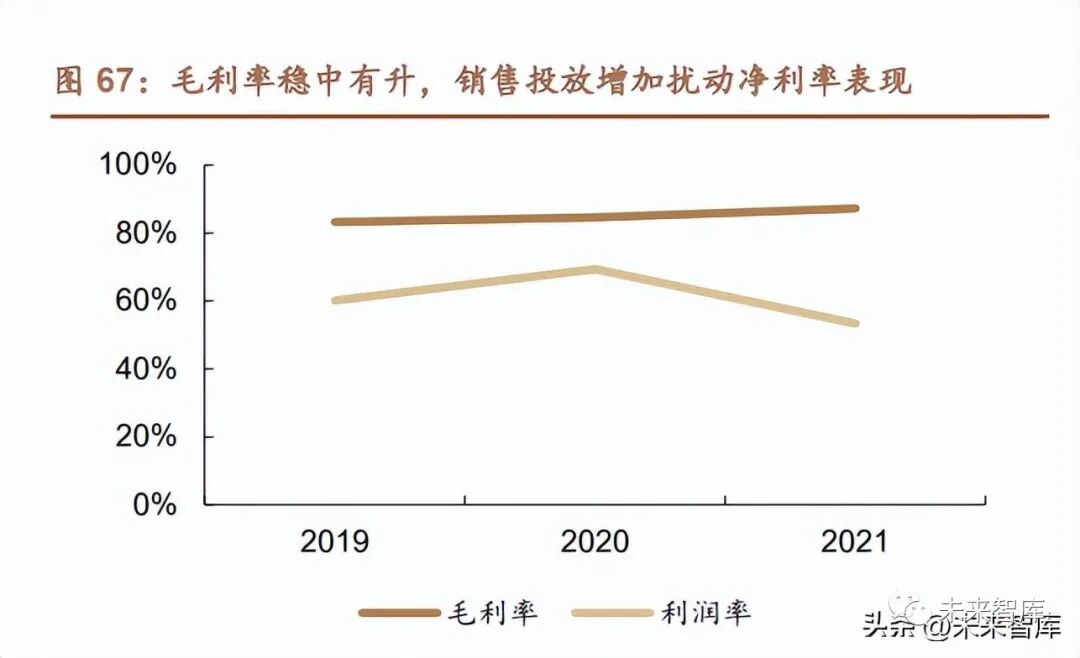 公司營業收入高速增長,2020 至 2021 年凈利潤增長緩慢。2019-2021 年實 現收入 9.57 億、11.90 億、15.52 億元,凈利潤為 5.75 億、8.26 億、8.28 億元, 經調整凈利潤分別為 5.75 億元、6.72 億元及 8.37 億元,通過增加線上直銷渠道 的投放,促進收入端大幅增長,同時銷售費用增加影響利潤表現。毛利率穩中有升,增加銷售投放擾動凈利率表現。在盈利能力方面,2019- 2021 年,巨子生物毛利率分別為 83.3%、84.6%、87.2%,保持較高的盈利能力 并呈現穩中有升趨勢,主因高毛利率的線上直銷收入大幅增長,渠道收入結構調 整拉高整體毛利率水平。同期凈利率分別為 60.1%、69.4%及 53.3%,經調整凈 利率分別為 60.1%、56.5%及 53.9%,銷售費用增加擾動凈利率。